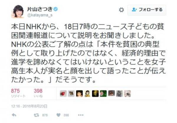 片山さつき議員 女子学生と 子どもの貧困 報道についてnhkから説明を受けツイート 16年8月24日 エキサイトニュース